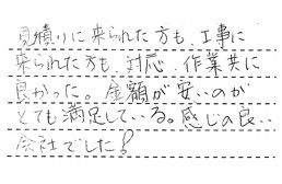 見積りに来られた方も、工事に来られた方も、対応・作業共に良かった。金額が安いのがとても満足している。感じの良い会社でした!