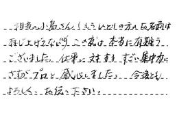 担当の小島さん(もうひとりの方のお名前は存じ上げてない)、この度は本当に有難うございました。仕事に対するすごい集中力。さすがプロと感じました。今後ともよろしくお伝え下さい。