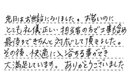 先日はお世話になりました。お若いのに、とても礼儀正しい担当者の方で、工事も含め最後まできちんと対応して頂きました。その後、快適に入浴する事ができ、大満足しています。ありがとうございました。