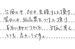 台風の中、即日見積りして頂け、翌日には給湯器をつけて頂け、本当に助かりました。対応が早くとても良かったです。
