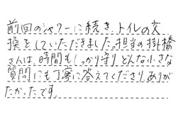 前回のシャワーに続き、トイレの交換をしていただきました。担当の掛橋さんは、時間もしっかり守り、どんな小さな質問にも丁寧に答えてくださり、ありがたかったです。