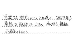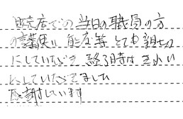 販売店での当日の職員の方の言葉遣い・態度等、とても親切にしていただき、終了時はきれいにしていただきました。感謝しています。