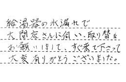 給湯器の水漏れで、大問屋さんに伺い、取り替えをお願いしまして、すぐ来て下さって、大変有りがとうございました。