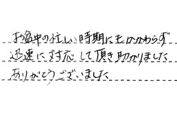 お盆中の忙しい時期にもかかわらず、迅速に対応して頂き、助かりました。ありがとうございました。