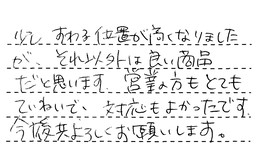 少しすわる位置が高くなりましたが、それ以外は良い商品だと思います。営業の方もとてもていねいで、対応もよかったです。今後共よろしくお願いします。