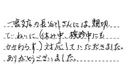 一宮支店の長谷川さんには、親切ていねいに(休み中、検診中にもかかわらず)対応していただきました。ありがとうございました。