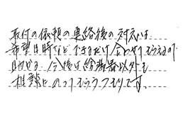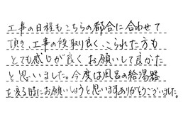 工事の日程も、こちらの都合に合わせて頂き、工事の段取り良く、こられた方もとても感じが良く、お願いして良かったと思いました。今度は風呂の給湯器を替える時に、お願いしようと思います。ありがとうございました。