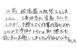 以前、給湯器の取替えをしました。工事担当が宮島さんでしたが、手際もよく作業内容もよかったので、今回のトイレの取り替えも、同じ方にお願いしました。今回もバッチリでした。