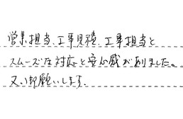 営業担当、工事見積、工事担当と、スムーズな対応と安心感がありました。又、御願いします。