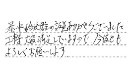 暑い中、給湯器の設置ありがとうございました。工事等、大変満足していますので、今後ともよろしくお願いします。