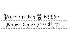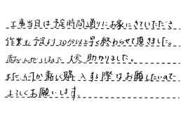 工事当日は、予定時間通りにお家にきていただき、作業も予定より30分以上早く終わらせて頂きました。赤ちゃんがいるので、大変助かりました。また何か新しく購入する際は、お願いしたいので、よろしくお願いします。