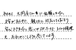 初めて大問屋さんに依頼しました。不安がある中で、親切に対応してくださり、安心できました。感じがよかったので、トイレの修理もおねがいしようと思っています。