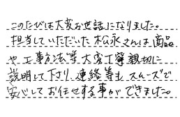 このたびは大変お世話になりました。担当していただいた松永さんは、商品や工事方法等、大変丁寧親切に説明して下さり、連絡等もスムーズで、安心してお任せする事ができました。
