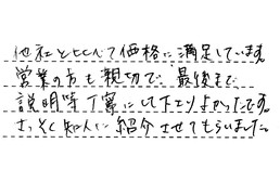 他社と比べて価格に満足しています。営業の方も親切で、最後まで説明等丁寧にして下さり、よかったです。さっそく知人に紹介させてもらいました。