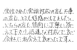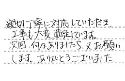 親切丁寧に対応していただき、工事も大変満足しています。次回、何かありましたら、又お願いします。ありがとうございました。