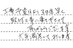 工事予定日より3日位早く取付工事に来て下さって、有りがとうございます。大変満足しております。