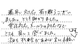 素早い対応、有り難うございました。とても助かりました。電話対応、メールでの対応など、とても良いと感じました。次回も機会があれば、宜しくお願いします。