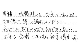 見積り依頼時から、大変ていねいな物腰で、詳しく説明してくださり、安心しておまかせできるのではと思い、工事を依頼しました。結果満足です。