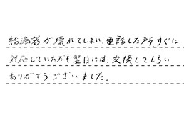 給湯器が壊れてしまい、電話した所、すぐに対応していただき、翌日には交換してもらい、ありがとうございました。