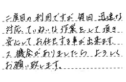 二度目の利用ですが、毎回、迅速な対応、ていねいな作業をして頂き、安心してお任せする事が出来ます。又、機会がありましたら、よろしくお願い致します。