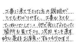 工事に来て下さった方の説明が、とてもわかりやすく、工事もとてもていねいでした。他で気になっていた箇所も見て下さり、次回そこを直す時も、是非お願いするつもりです!!