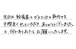 先日は、給湯器とガスコンロの取付けを手際良くやっていただき、ありがとうございました。又、何かありましたら、お願いいたします。