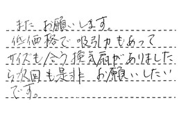 またお願いします。低価格で吸引力もあって、サイズも合う換気扇がありましたら、次回も是非お願いしたいです。