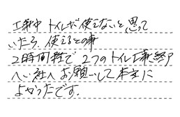 工事中、トイレが使えないと思っていたら、使えるとの事、2時間程で、2つのトイレ工事終了。へい社へお願いして本当によかったです。