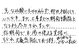 急な依頼にもかかわらず、即日対応していただき、また工事までの期間も最短となるよう尽力されました。短期間でお湯の使える生活にもどれ、大変感謝しております。ありがとうございました。