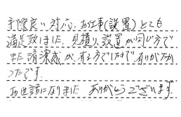 手際良い対応、お仕事(設置)、とても満足致しました。見積り、設置が同じ方で、また、清涼感が有る方でしたので、有りがたかったです。お世話になりました。ありがとうございます。