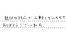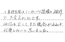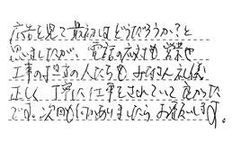 広告を見て、最初はどうだろうか? と思いましたが、電話の応対も、営業や工事の担当の人たちも、みなさん礼儀正しく、丁寧に仕事をされていて、良かったです。次回も何かありましたら、お願いします。