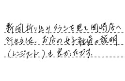 新聞折り込みチラシを見て岡崎店へ行きました。お店の女子社員の説明(レンジフード)も良かったです。
