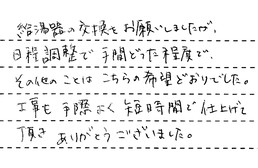 給湯器の交換をお願いしましたが、日程調整で手間どった程度で、その他のことは、こちらの希望どおりでした。工事も手際よく、短時間で仕上げて頂き、ありがとうございました。