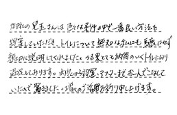 御社の兒玉さんは、色々な条件の中で、一番良い方法を提案していただき、トイレについて無知な私にも、馬鹿にせず親切に説明してくれました。結果としても納得のいくトイレになり、満足しております。内装から設置・アフターまで、お一人でこなしていたので、驚きました。益々のご活躍お祈り申し上げます。