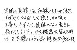 早朝の見積りをお願いしたのですが、すばやく対応して頂き、その後の工事も手早くて、無駄のない動きに感心しました。ガス機器を替える時は、又、お願いしようと思います。ありがとうございます。