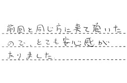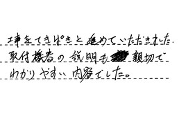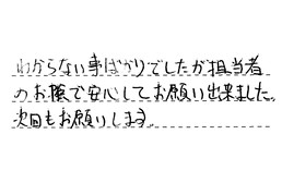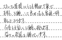 スタッフの皆様は、とても親切丁寧で、本当にお願いして良かったと、家族一同喜んております。今後とも宜しくお願い致します。益々の発展を願っています。