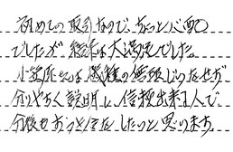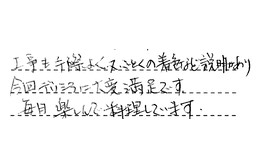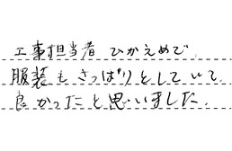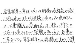 営業担当の安江さんは、何事にも対応が早く、こちらのわがままな相談にものってくれました。又、工事職人の前田さんは、狭い所での大変な工事でしたが、笑顔の多い方で、仕事が丁寧でした。営業担当との連携がよかったです。
