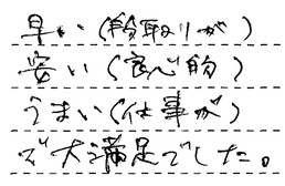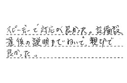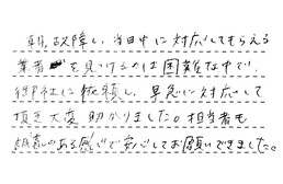 朝、故障し、当日中に対応してもらえる業者を見つけるのは困難な中で、御社に依頼し、早急に対応して頂き、大変助かりました。担当者も調査のある感じで、安心してお願いできました。