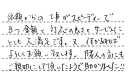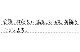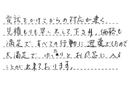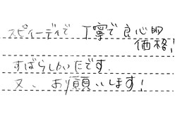 依頼からの工事がスピーディーで、且つ金額と対応の良さとサービスに、とても大満足です。又、何かあれば、よろしくお願い致します。隣人の方にもご親切にして頂いたようで、助かりました!!