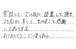 電話して、次の日に設置して頂き、対応が早くて、ものすごく感謝しております。ありがとうございました。