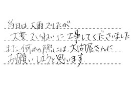 当日は大雨でしたが、大変ていねいに工事してくださいました。また何かの際には、大問屋さんにお願いしようと思います。