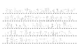今回初めてリフォームをお願いしたのですが、担当の方の対応がとても良かったです。次もこの方にお願いしようと思っています。工事もとてもていねいでした。本当にありがとうございました。
