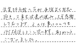 営業担当者の方が、手際よく対応頂き、工事も迅速に進み、大変感謝しております。又の工事についても、御相談しようと思います。ありがとうございました。