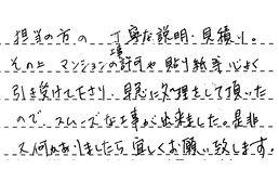 担当の方の丁寧な説明・見積り、その上、マンションの工事許可や貼り紙等、快く引き受けて下さり、早急に処理をして頂いたので、スムーズな工事が出来ました。是非、又何かありましたら、宜しくお願い致します。