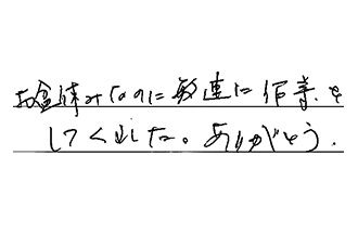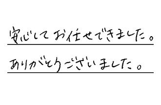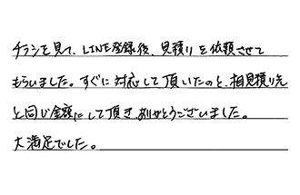 チラシを見て、LINE登録後、見積りを依頼させてもらいました。すぐに対応して頂いたのと、相見積り先と同じ金額にして頂き、ありがとうございました。大満足でした。
