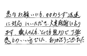 急なお願いにもかかわらず、迅速に対応していただき、大変感謝しております。職人さんも、とっても親切で丁寧、感じのいい方でした。ありがとうございました。