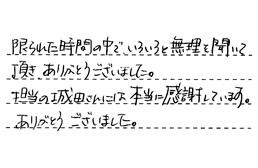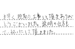 手早く段取り・工事して頂き、ありがとうございました。説明の仕方も、ていねいにして頂きました。