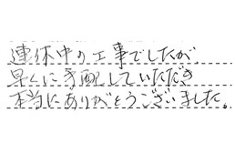 連休中の工事でしたが、早くに手配していただき、本当にありがとうございました。