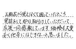 お風呂が使えなくて困っていたところ、電話をして即日取付けしていただいて、家族一同感激しています。価格も大変安く、他店にはできないと思いました。