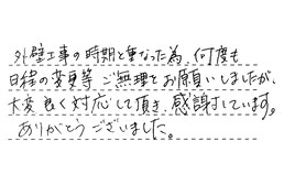 外壁工事の時期と重なった為、何度も日程の変更等、ご無理をお願いしましたが、大変良く対応して頂き、感謝しています。ありがとうございました。